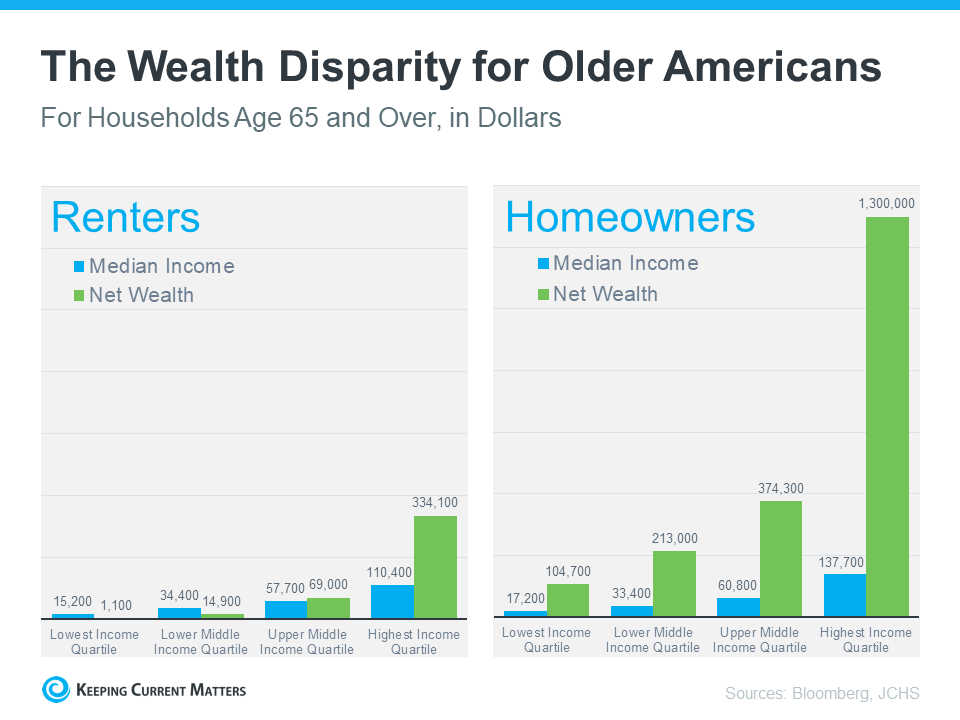 To help you understand just how much owning a home can have a positive impact on your life over the years, take a look at what the data shows. The same Bloomberg article helps show the gap in wealth between renters and homeowners who are 65 years and older (see graph below). The difference is substantial, even when incomes are similar.